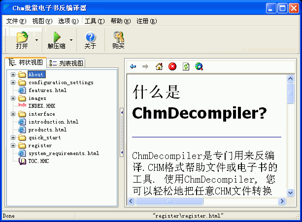 “CHM电子书批量反编译器”(CHMDecompiler)是一款专门用来反编译CHM电子书源文件的工具软件,可以迅速地释放包括在CHM电子书里面的全部源文件(包括网页、文本、图片、CHM、ZIP、EXE等全部源文件),并且完美地恢复源文件的全部目录结构及文件名,特别是CHMDecompiler可以完美重建.HHP工程文件(包括恢复全部上下文相关的ALIAS和MAP信息),以方便用户对源文件二次编辑后可以完全使用原来的CHM设置重新编译生成该CHM文件,以便帮助用户得到源文件进行资料恢复或二次编辑。提供多种反编译方式供用户选择:可以只释放CHM电子书里面的任意一个文件、任意一个目录;也可以释放CHM里面的全部文件,另外,“CHM电子书批量反编译器”(CHMDecompiler)的注册版本支持批量操作。同时,“CHM电子书批量反编译器”(CHMDecompiler)也可以作为CHM电子书的阅读器,这也是本软件的特色之一:用户可以在浏览阅读CHM电子书的同时选择释放出自己需要的文件。